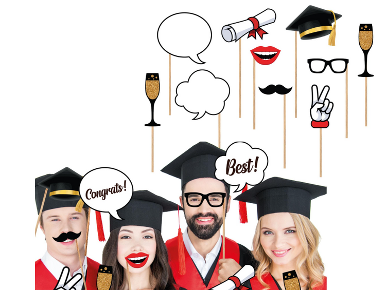 - Zestaw zawiera 10 różnorodnych rekwizytów na patyczkach, nawiązujących do tematyki ukończenia szkoły i życia studenckiego.