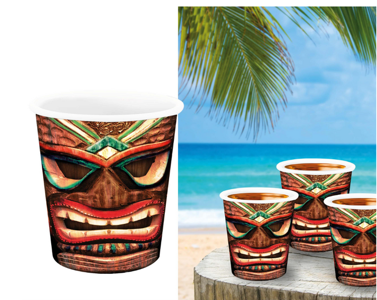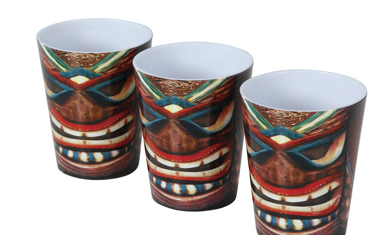 - Zestaw 3 kieliszków z barwnym nadrukiem maski Tiki, inspirowanym hawajską kulturą.