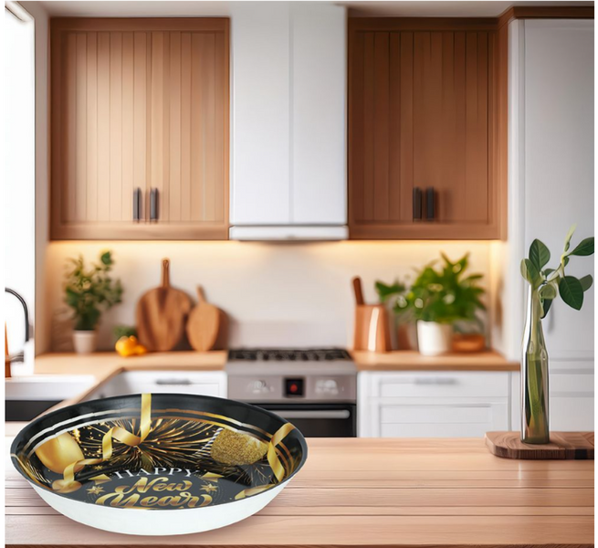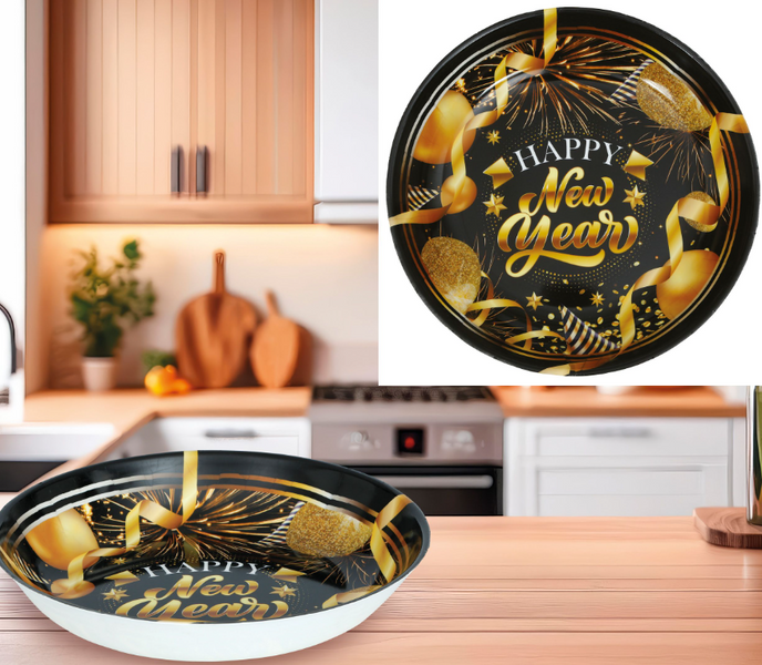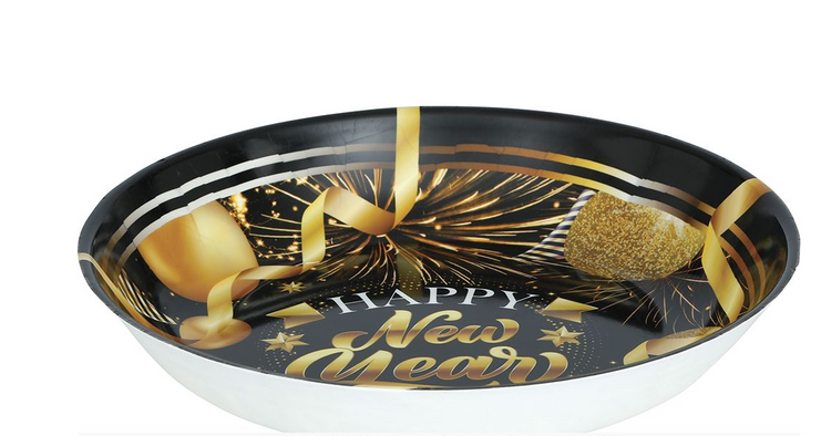 - Miska w kolorze czarnym ze złotymi zdobieniami i napisem „Happy New Year”.