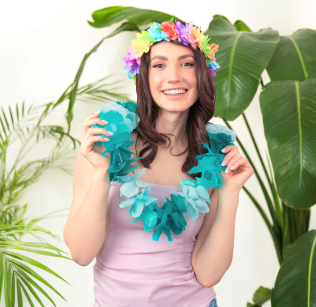 - Naszyjnik wykonany z lekkich, sztucznych kwiatów w intensywnym turkusowym kolorze.