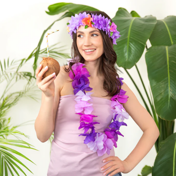 - Naszyjnik wykonany z lekkich, sztucznych kwiatów w intensywnym fioletowym kolorze.