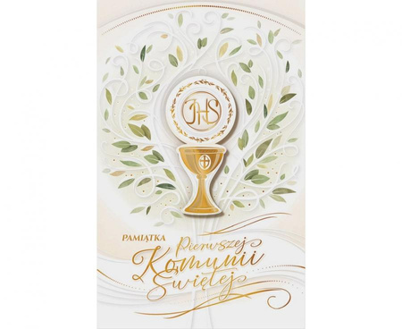 KARTKA OKOLICZNOŚCIOWA KOMUNIJNA, KIELICH IHS, ZIELONE LIŚCIE Kolor: różnokolorowy Materiał: papier Ilość: 1 szt. Producent: AB Card W zestawie: kartka okolicznościowa oraz koperta