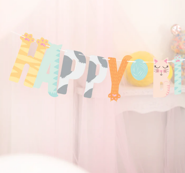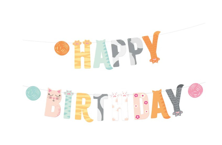 - Baner składa się z napisu "Happy Birthday", w którym każda litera ma unikalny koci motyw – literki są papierowe.