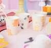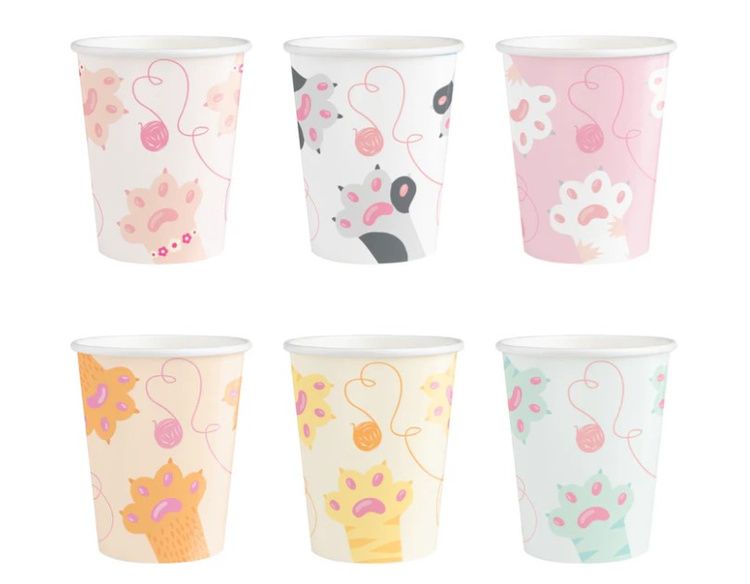 - Zestaw zawiera 6 papierowych kubków, każdy z unikalnym kolorem i wzorem kocich łapek.