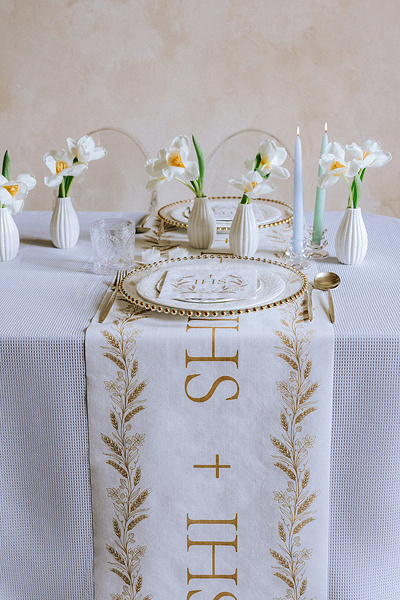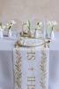 – Bieżnik komunijny z fizeliny – w kolorze białym ze złotym nadrukiem; szerokość 40 cm, długość 5 m.
