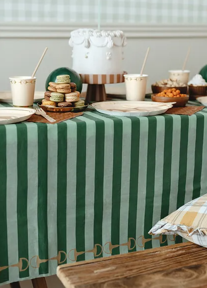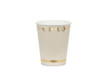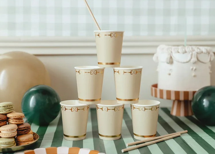 - Beżowe kubeczki papierowe z eleganckim, złotym nadrukiem strzemion.