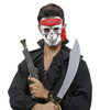 Maska wykonana z solidnego plastiku. Koloru srebrnego. Wiązana za pomocą tasiemek. Zdobiona czerwoną, plastikową bandaną. Usta są uśmiechnięte, z brakującymi zębami. W masce wycięte są otwory na oczy oraz częściowo na usta.