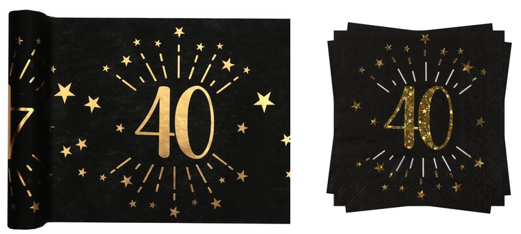 -bieżnik wykonany z flizeliny w kolorze czarnym ze złotym nadrukiem liczby 40 i gwiazdek o wymiarze 30 x 500 cm,