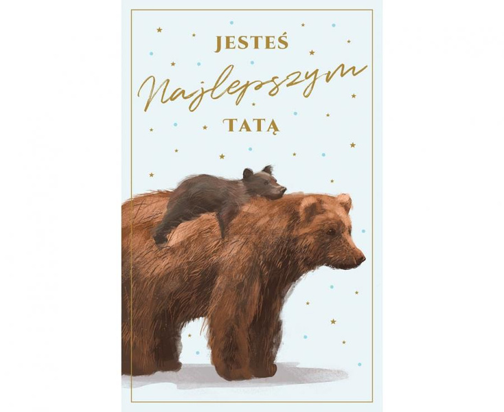 Wewnątrz kartki znajdują się gotowe życzenia: Kochany Tato W DNIU TWOJEGO ŚWIĘTA SŁOWA NAJWIĘKSZEJ WDZIĘCZNOŚCI ZA WCZORAJ I DZIŚ, ZA WSZYSTKIE TRUDY I STARANIA. ŻYCZENIA ZDROWIA, SAMYCH POGODNYCH DNI ORAZ ENERGII DO DZIAŁANIA!