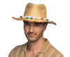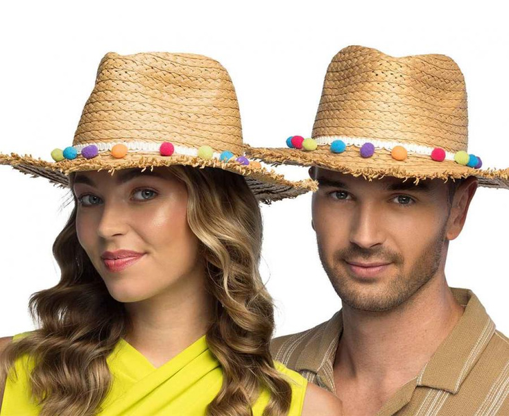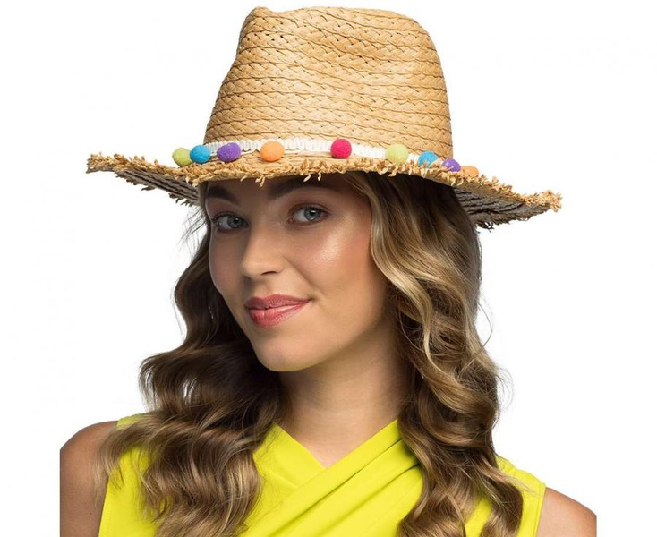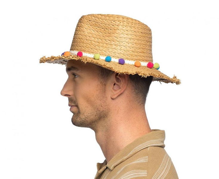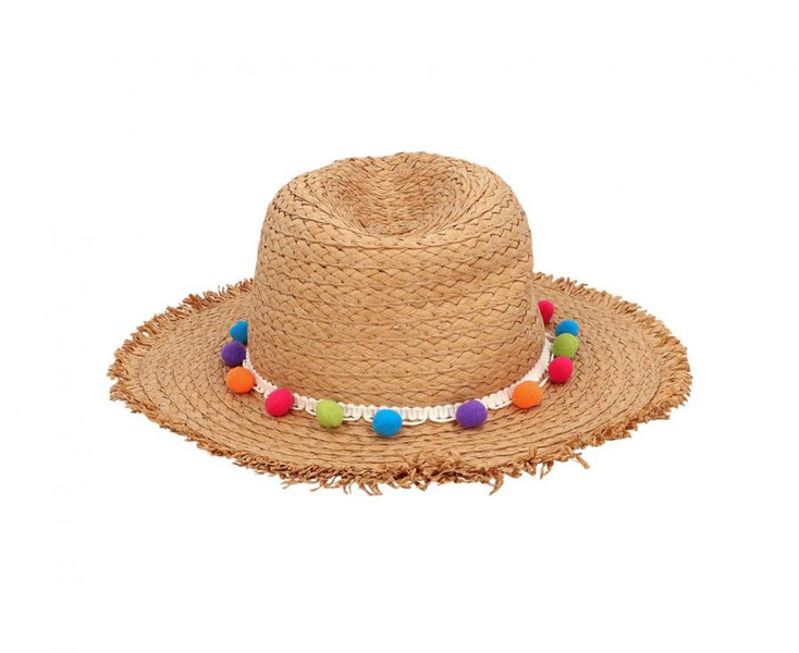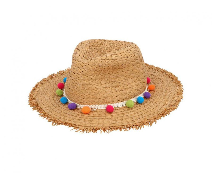 Kapelusz słomkowy z kolorowymi pomponikami.