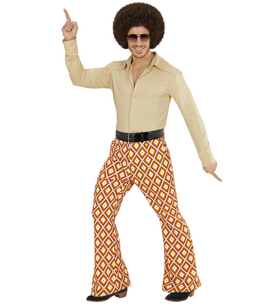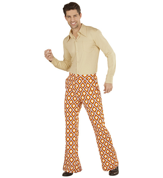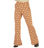 Spodnie typu dzwony wykonane z materiału we wzory w stylu lat 70. Zapinane na guzik i zamek.