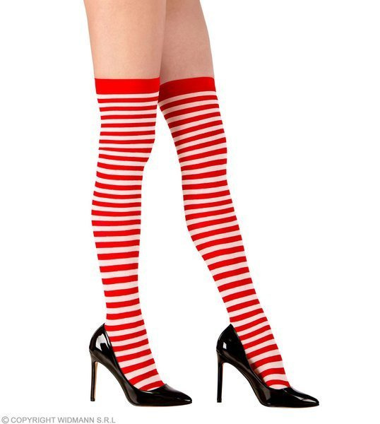 Czerwono- białe pończochy wykonane z nylonu (98%) z dodatkiem elastycznego spandexu. Pończochy są matowe. Wykonane z wysokiej jakości materiałów.