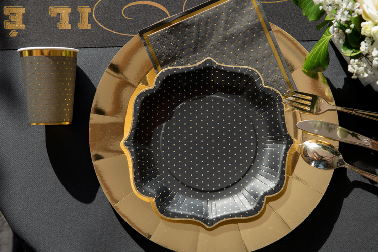 Czarne Talerzyki Papierowe ze Złotymi Kropkami