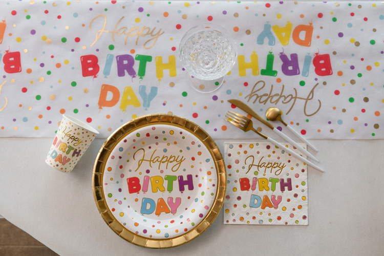 - Nadruk: Napis "Happy Birthday" + kolorowe kropki