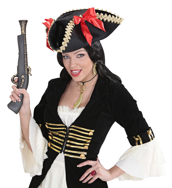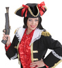 Kapelusz piracki w kolorze czarnym. Wykonany z piankowego materiału. Zdobiony czerwonymi kokardami i złotą tasiemką.