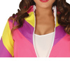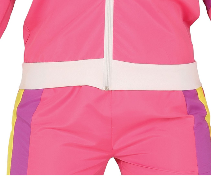 Strój w kolorze różu z żółtymi i fioletowymi paskami.