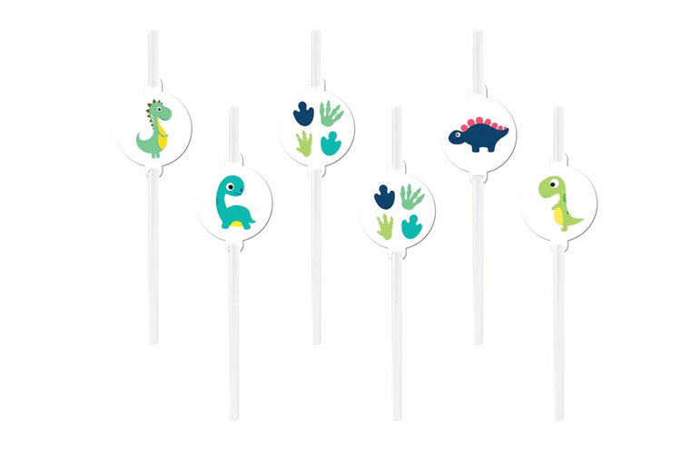 - Komplet prostych słomek z medalionami przedstawiającymi kolorowe, uśmiechnięte dinozaury.