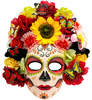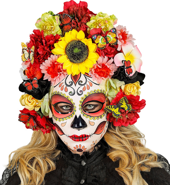 Przedstawia twarz szkieletu z bukietem kwiatów na głowie.