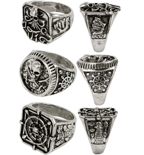 - Zestaw posebrzanych pierścionków inspirowanych pirackim stylem.