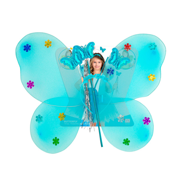Wymiary: Skrzydełka: długość ok. 35 cm, szerokość ok. 50 cm, Różdżka: długość ok. 35 cm, Opaska: szerokość zewnętrzna ok. 33 cm.