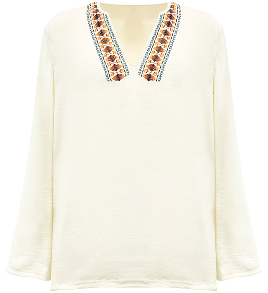 Produkt w kremowym kolorze z kolorowymi akcentami przy dekolcie.