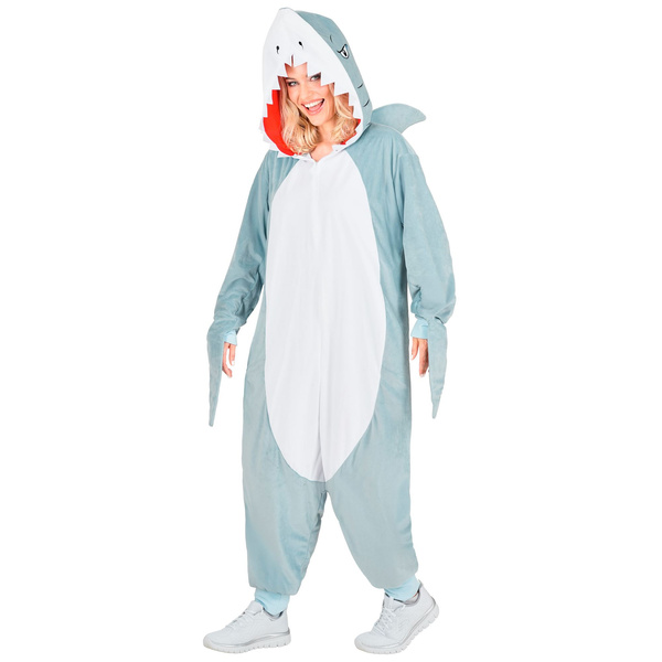 Kombinezon w kolorze szarym zdobiony kapturem z głową rekina.