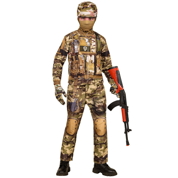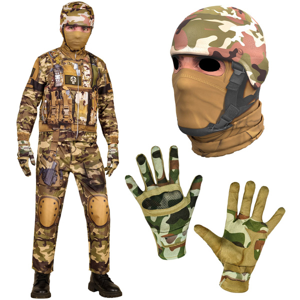 Strój Żołnierza Komandosa z nadrukiem. Zestaw zawiera: bluzę, spodnie, rękawiczki, maskę. Skład: 100% poliester.