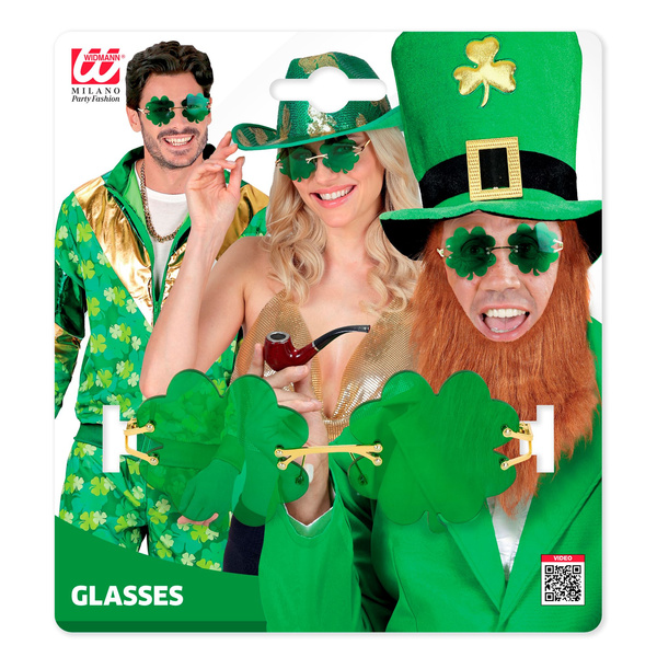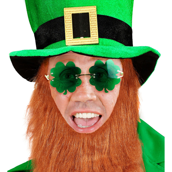Okulary w kształcie zielonych koniczynek.