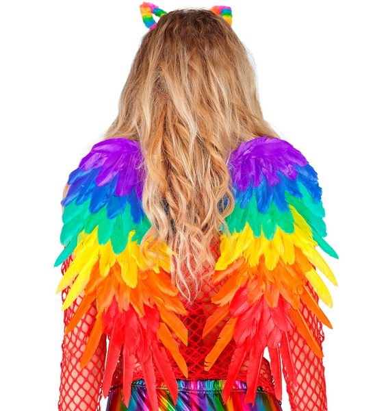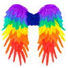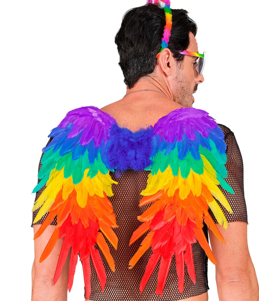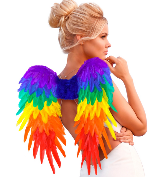 - Ozdobione sztucznymi tęczowymi piórkami.