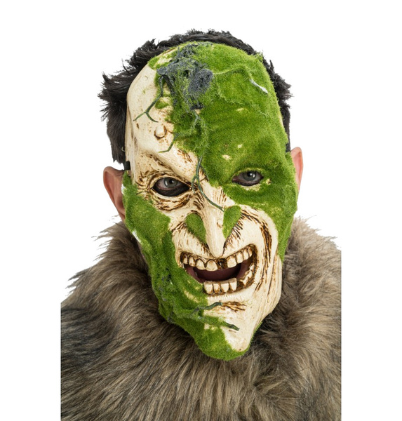 - Pokryta dekoracyjnym mchem imitującym trawę – nadaje masce realistyczny, naturalny wygląd rodem z głębi lasu.