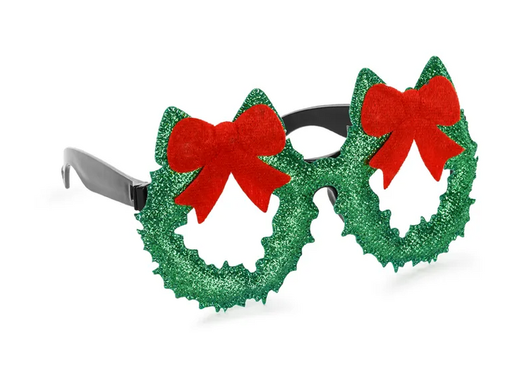 - Okulary w kształcie świątecznych wieńców, ozdobione czerwonymi kokardkami.