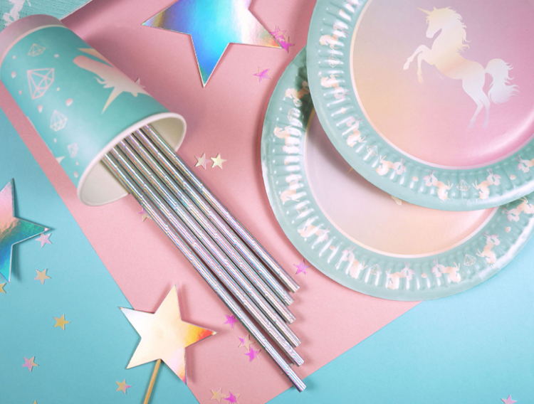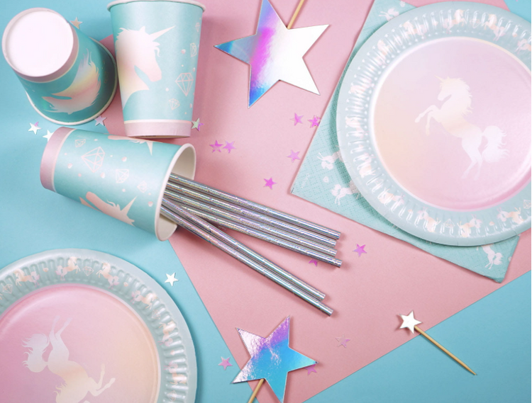 - Zestaw zawiera 8 papierowych talerzyków z nadrukiem jednorożca.