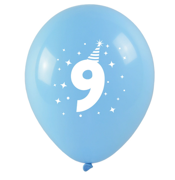 - Zestaw zawiera 3 balony z białym nadrukiem cyfry 9, widocznym po obu stronach.