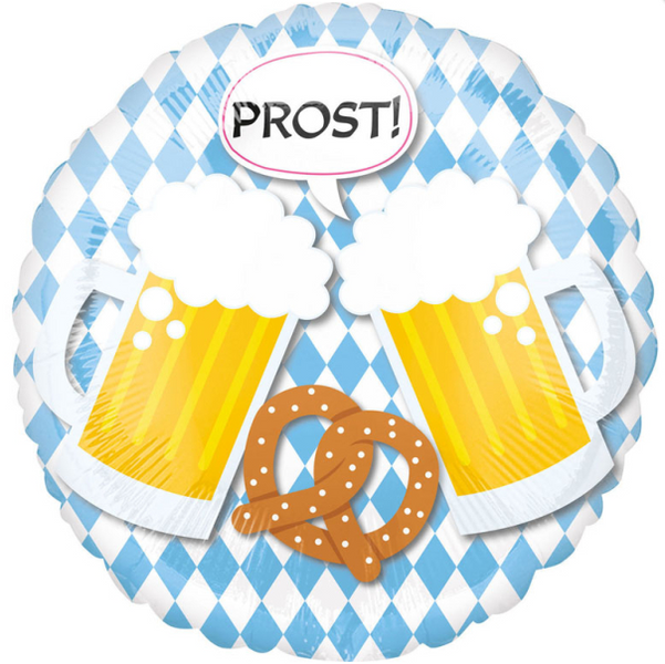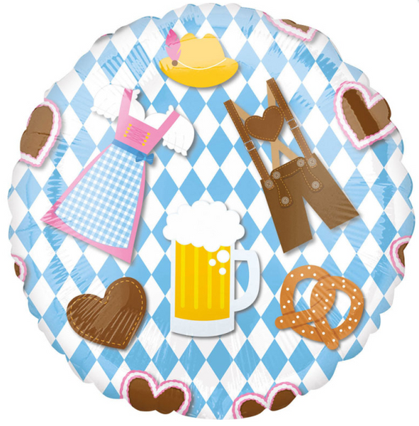 - Okrągły balon foliowy z grafikami typowymi dla Oktoberfest – m.in. piwo, precle, stroje ludowe, serduszka i napis „PROST!”.