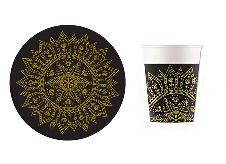 Zestaw imprezowy w kolorze czarnym ze złotą mandalą.