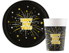 Zestaw czarnych kubeczków i talerzyków na imprezę sylwestrową ze złotym napisem "Happy New Year".