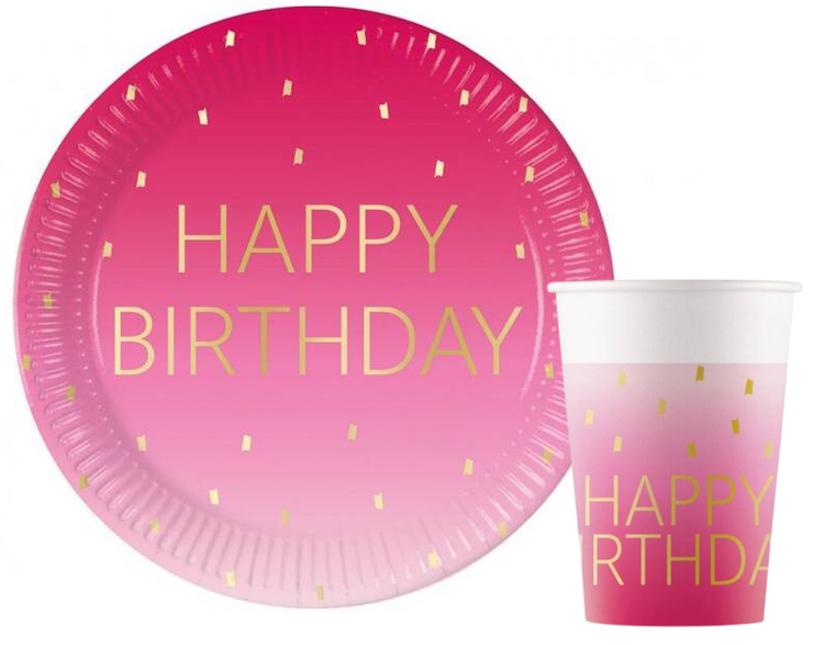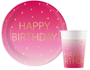 ZESTAW HAPPY BIRTHDAY RÓŻOWY TALERZYKI+KUBECZKI