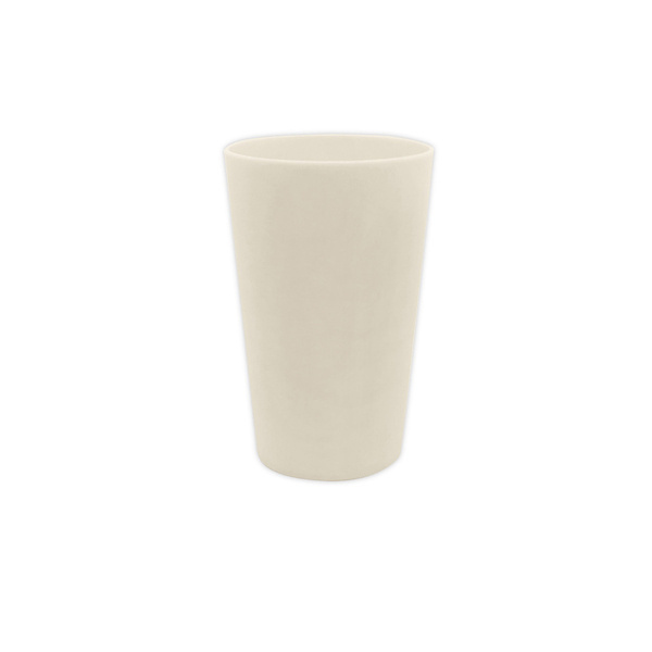 Zestaw kubeczków i talerzyków wielorazowych w kolorze beżowym.