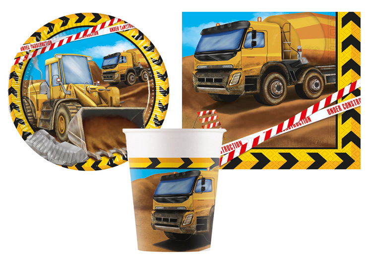 Zestaw z motywem budowy z nadrukiem pojazdów budowlanych.