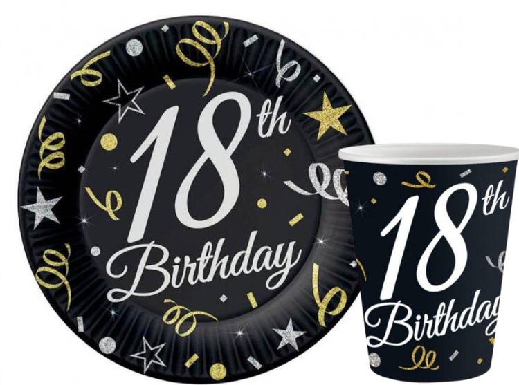 Zastawa jednorazowa na 18 urodziny z nadrukiem "18th Birthday" oraz ozdobami w postaci złotych i srebrnych serpentym.