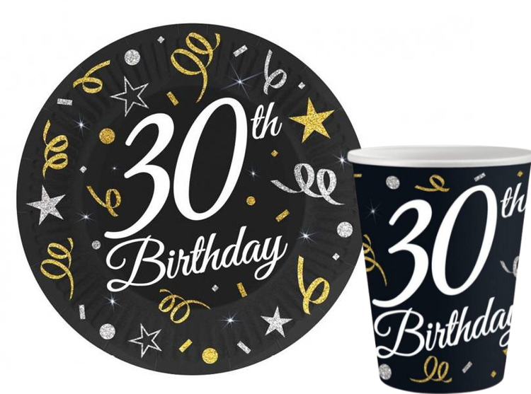 Zastawa jednorazowa na 30 urodziny z nadrukiem "30th Birthday" oraz ozdobami w postaci złotych i srebrnych serpentym.