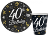 Zastawa jednorazowa na 40 urodziny z nadrukiem "40th Birthday" oraz ozdobami w postaci złotych i srebrnych serpentym.