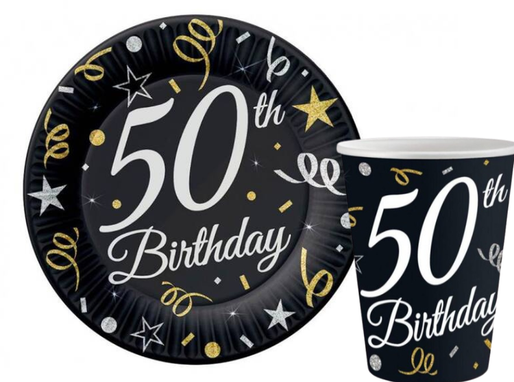 Zastawa jednorazowa na 50 urodziny z nadrukiem "50th Birthday" oraz ozdobami w postaci złotych i srebrnych serpentym.