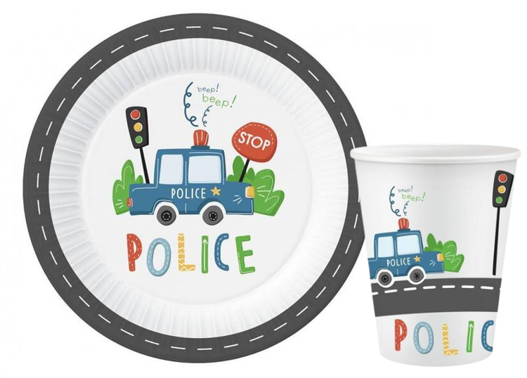 Zastawa jednorazowa z nadrukiem policji.