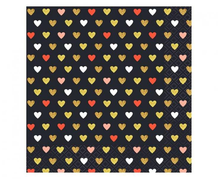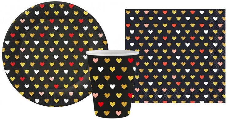 Zastawa jednorazowa w kolorze czarnym z nadrukiem kolorowych serduszek.