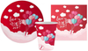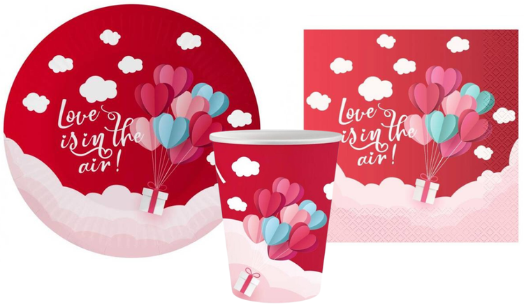 Zastawa jednorazowa z kolekcji "Love is in the air" w kolorze czerwonym z nadrukiem serduszek.