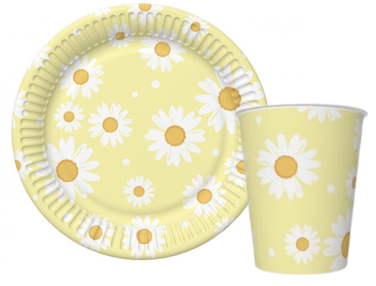 Zastawa jednorazowa w kolorze żółtym z motywem stokrotek.