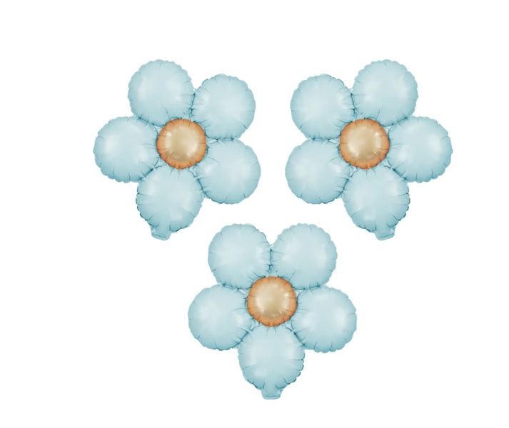- Zestaw zawiera 3 balony foliowe w kształcie kwiatów w kolorze niebieskim z delikatnym, złotym środkiem.