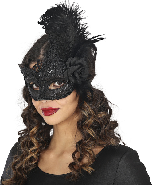 Maska wenecka z piórami i kwiatem.
