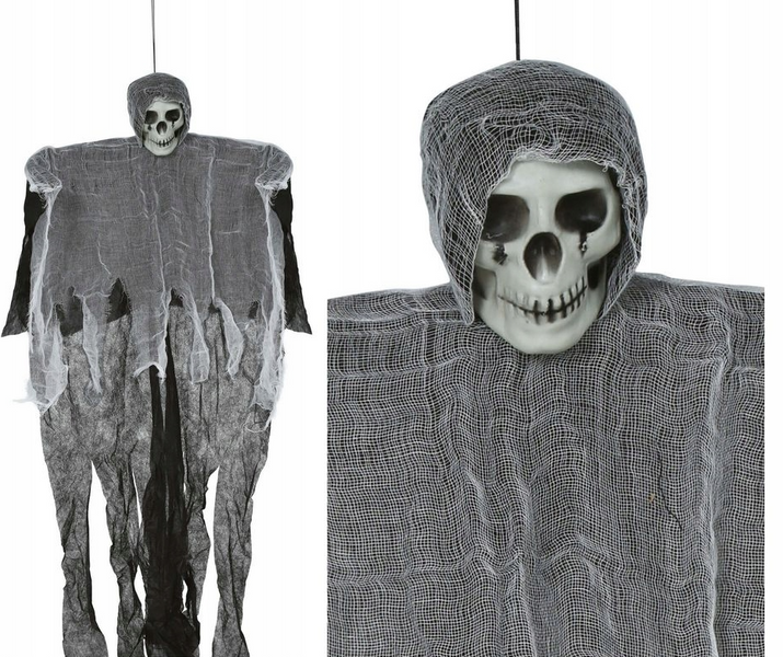 - Upiorny szkielet z realistyczną czaszką i długim, postrzępionym materiałem w odcieniach szarości i czerni.